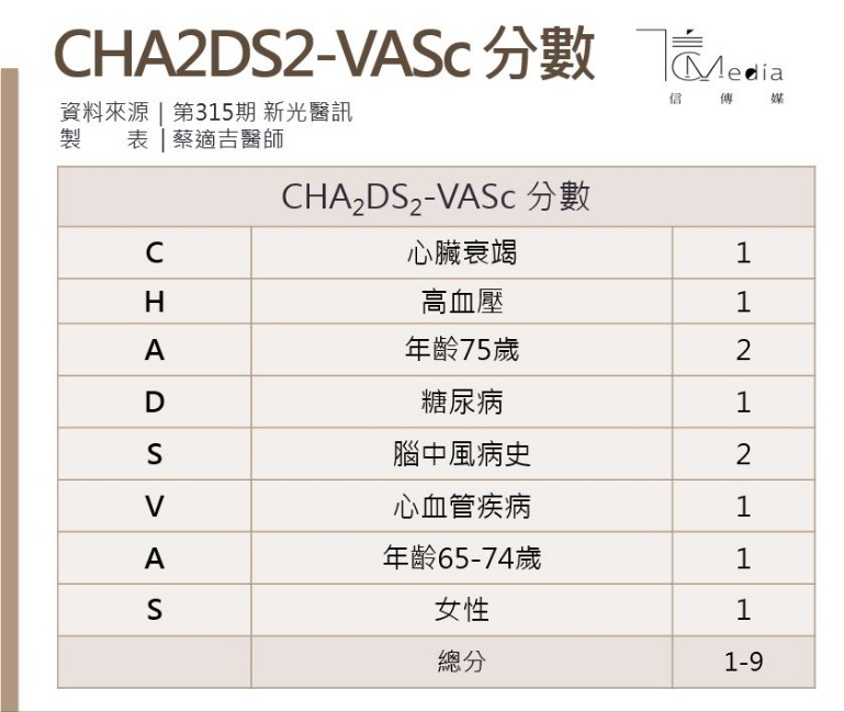 針對心房顫動病人,目前有一簡單的評分方法CHA2DS2-VASc分數(如表),來評估未來發生腦中風的可能性。評估出的分數:總分0分,為低度風險性;總分1分,為中度風險性;總分 2-9分,為高度風險性,例如:60歲有糖尿病之心房顫動病患,CHA2DS2-VASc分數為1分,發生腦中風機會為中度風險。依據CHA2DS2-VASc評估出的總分,男性大於第於1分或女性等於大於2分,經由醫師診治後,來服用抗血栓藥物,預防腦中風的發生。