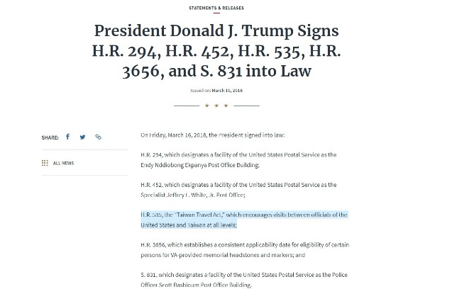 美國白宮官網於美國時間16日公布了總統川普簽署了5項法案,其中包括了第「H.R. 535」的「台灣旅行法」法案,官方網站上紀載「H.R. 535, the “Taiwan Travel Act,” which encourages visits between officials of the United States and Taiwan at all levels」。