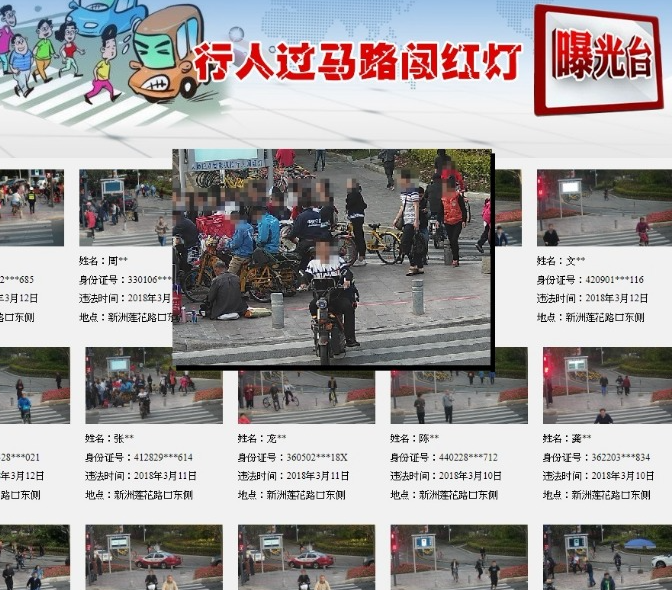 中國警方發布行人過馬路闖紅燈曝光台,利用AI人臉辨識技術,將每一位闖紅燈的行人照片以馬賽克形式公布在網路上,上面揭露了闖紅燈的時間與地點、身分證字號等部分個人資訊,應該已是全世界最先進的行人闖紅燈監控系統。