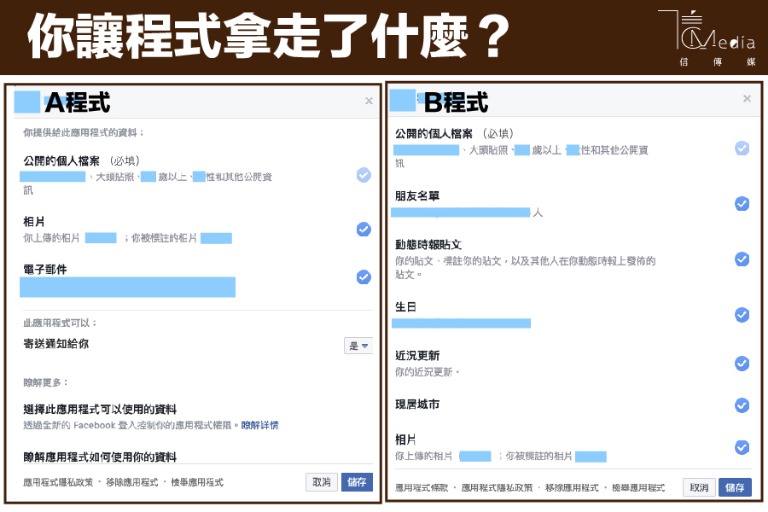 或許你也會想,公開在臉書上的資料可能只有年紀、性別等等,授權給對方也無所謂吧?但你授權給對方的,可能不只這些公開資料,時常還會包含你上傳過的照片、電子郵件,甚至也授權對方可以主動騷擾你、推播你的權限。