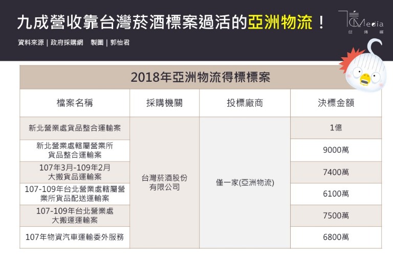 更離譜的是,徐永明指出,台酒公司各主要的標案都是由亞洲物流公司得標,因為只有亞洲物流一家公司來投標。