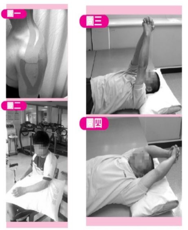 2. 貼紮治療: 肌內效貼布(如圖一) 將肩關節做有效的固定支撐,可促進血液循環減輕疼痛。