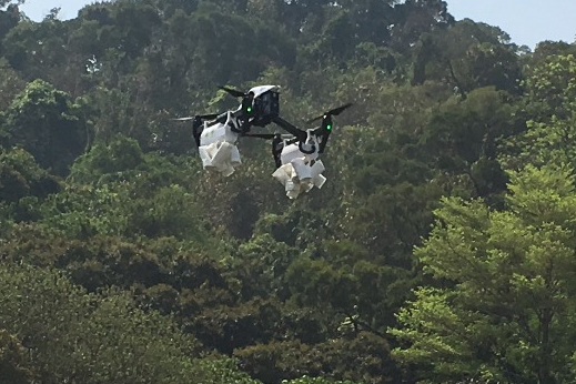 農業局表示,無人機每次飛行可釋放3萬隻平腹小蜂,防治範圍達2至3公頃,不僅能節省大量人力成本,防治範圍也更全面完備,可讓生物防治發揮最大效益。