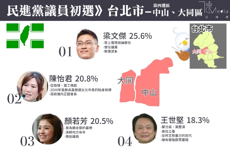 民進黨11日公布台北市中山大同區議員初選,這裡也算是綠營勢力較強的地方,現任議員都要尋求連任,只有一位新人陳怡君參與角逐,在前行政院長游錫堃與台中市長林佳龍的拉抬下奮力突圍,拉下老將黃向羣,與梁文傑、顏若芳及王世堅進入大選。