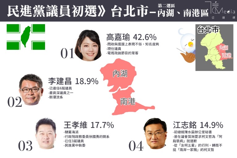 台北市內湖南港區議員應選9席,民進黨決定提名4席,採保守策略,12日公布的初選民調,美女議員高嘉瑜以超過4成支持度,遙遙領先黨內對手,而老將李建昌、王孝維、江志銘亦取得初選前4名,「新人」蕭亞譚殿後,無緣晉級。