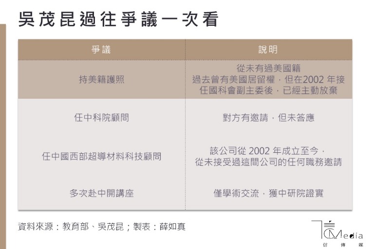 對此,吳茂昆聲明上述爭議都已經過相關單位調查,希望外界別再舊事重提。而在正式公布將由他接任教育部長一職後,便陸續有特定人士爆料其多次赴中開設講座,接受中國國科院的顧問職、甚至曾擔任中國西部超導材料科技有限公司的顧問。對此,吳茂昆今也嚴正聲明「我赴中從頭到尾就是為了交流,和中方絕對沒有任何合作,這就是事實。」直指這些都是莫須有的指控。