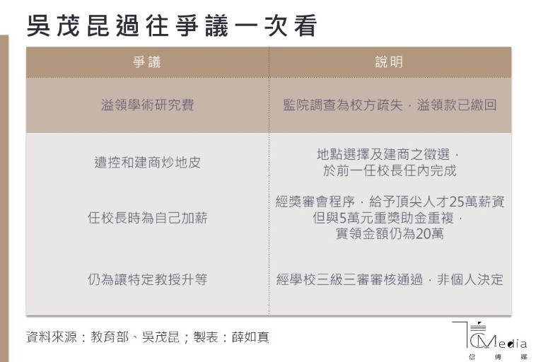 事實上,在吳茂昆出任教育部長以前,在東華大學裡的評價就相當兩極。就學生方面,過去太陽花學運爆發時,吳茂昆曾公開挺學生透過公共參與表達意見,也表明「為學術自主,佔領我校長室也OK」,此話一出吳茂昆聲名大噪,大批學生肯定這位校長的進步思想。不過,在教師界,這位校長就曾被爆出溢領獎助金、擔任校長時為自己加薪、讓特定教授升等、和建商炒地皮等爭議。今東華大學教授王純娟也赴北檢告發吳茂昆涉嫌貪汙。