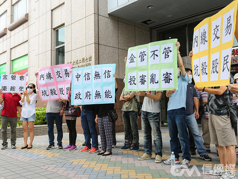 為此,十多名看似你我無異的投資人還鼓起勇氣走上街頭,在2日上午於金管會大樓前,喊著「內線交易、坑殺股民」,「中信無信、政府無能」,「金管不管、投審亂審」等簡單口號,並且提出三大訴求: