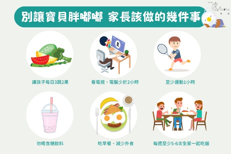 好的飲食習慣的建立,家長身教是非常重要,因此提醒您,不要在孩子面前,批評食物的好壞;不要只挑自己喜歡的食物吃;不要把食物當成獎勵、強迫、恐嚇、威脅的工具,而影響孩子進食的行為。讓家中盡量不要有高熱量食物,如甜點、巧克力、奶油、含糖飲料等;幫孩子準備一個健康食物餐桌及營造愉快的進餐環境,讓孩子健康快樂成長,遠離肥胖的威脅。