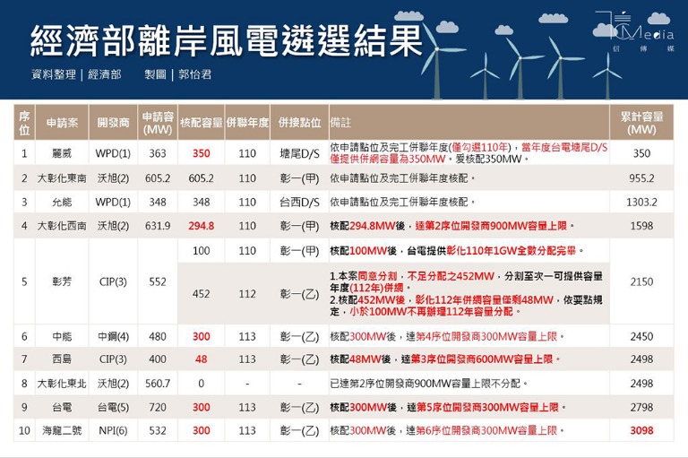 經濟部今(30)日召開說明記者會,公布離岸風電規劃場址遴選會議及容量分配結果,計有5家外商、2家本土開發商 (共11個離岸風場)為獲選業者。獲選容量區域分佈上,則以彰化地區 2,400MW(62.6%)為最高,其次分為雲林地區708MW(18.4%)、苗栗地區378MW(9.9%)及桃園地區350MW(9.1%)。